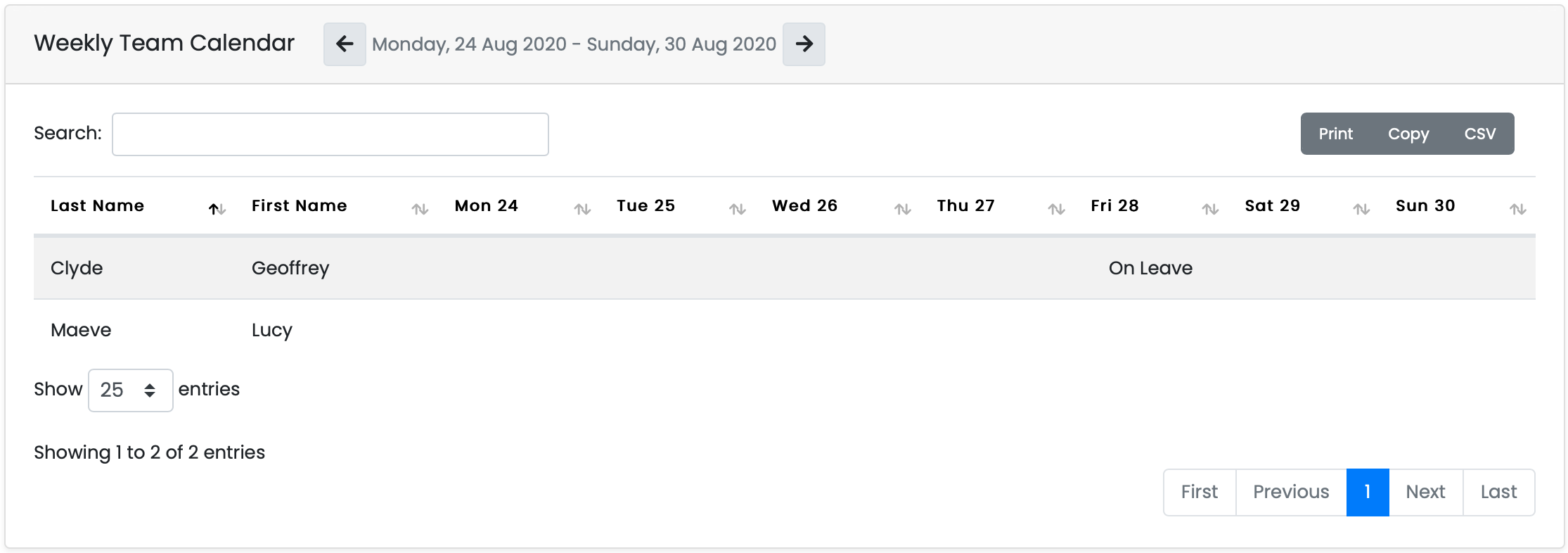 The weekly team calendar is a small tool to show you upcoming leave being taken by yourself and members of your team. You can also cycle the dates at the top to check upcoming weeks if any leave has been requested.