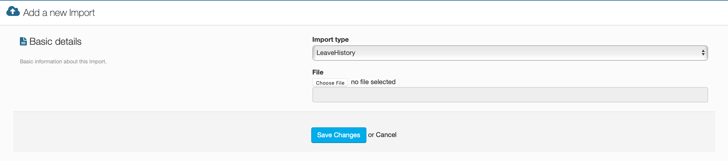 Importing your companies leave history is the final import for you to do when setting up, this will ensure that all the backlog of information pertaining to when and how long your employees have taken leave for is pushed up to the portal for viewing. To import your leave history, head over to the imports screen and click on 'Add a New Import'. This will bring you to the following screen.