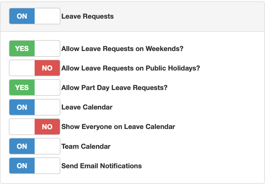 To stop email notifications getting sent out from the portal, under the account settings tab, click on the features option. You will see a box of options for leave requests, to stop notifications for these click on the 'Send Email Notifications', toggle this to off if you wish to stop email notifications getting sent out for leave requests.
