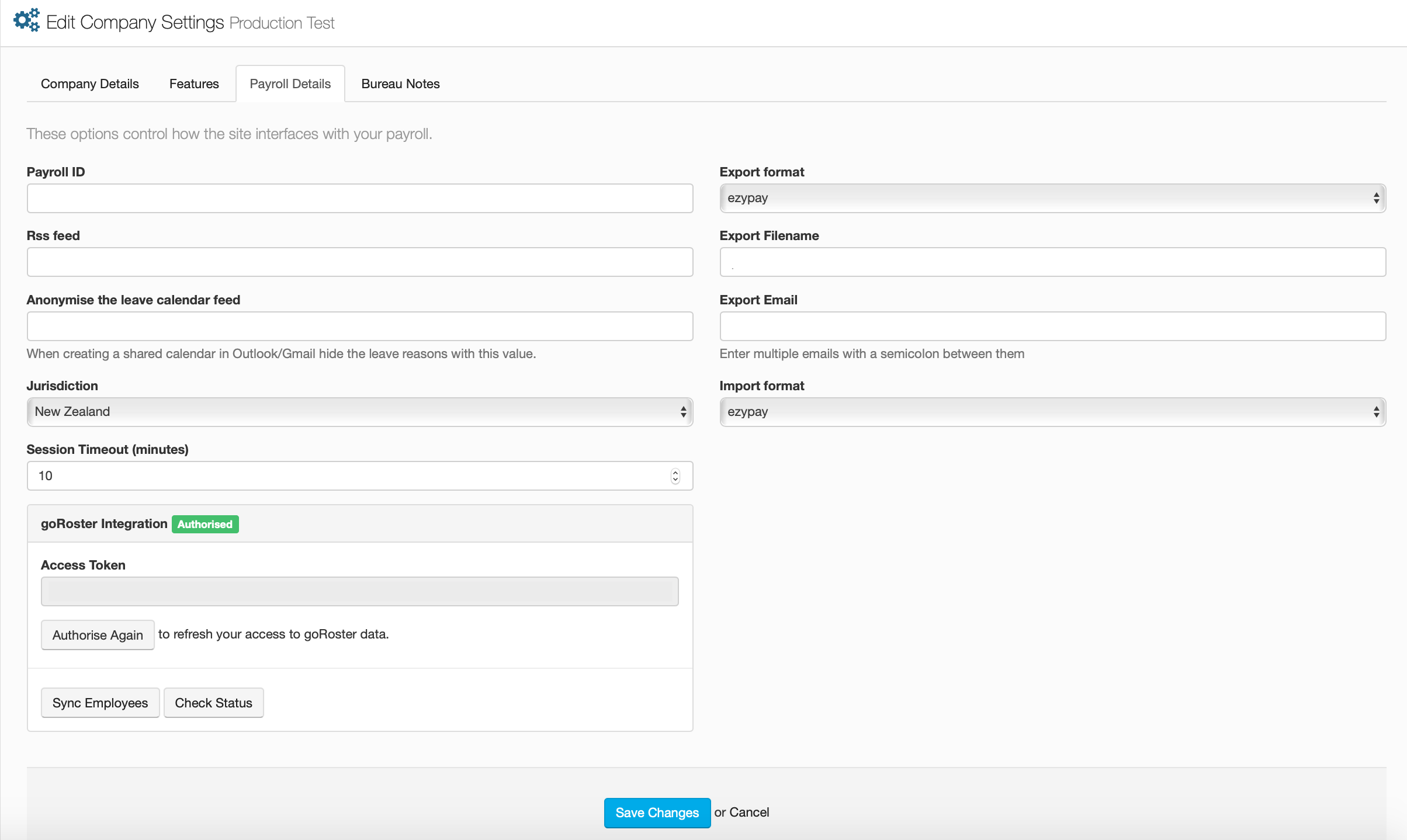 This screen is for the maintenance of your payroll identification details, here you can change the ID of your payroll on the portal, set your jurisdiction, change or add your exporting details. You also have the token screen for goRoster, which is where you activate and authorise your goRoster integration.