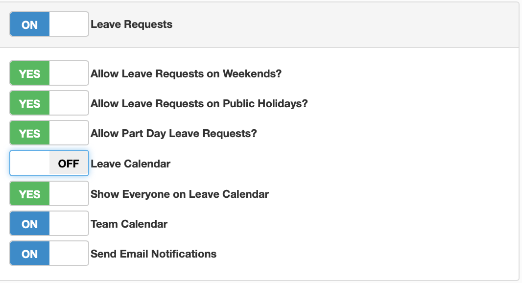 To disable the leave calendar, you need to head over to your account settings where you will find the functions tab. Under this tab will be a segment called 'Leave Requests', which is where you will find the toggle bar for the leave calendar. To disable it, move the slider from 'ON' to 'OFF'.