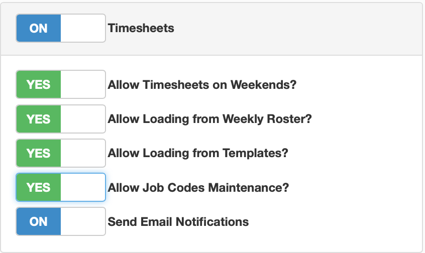 When you are looking at the 'Features' tab, you will notice a box with sliders for timesheets. If these are not active you will not have access to any timesheet options, however, moving the option to 'YES', will give you five sliders you can use.