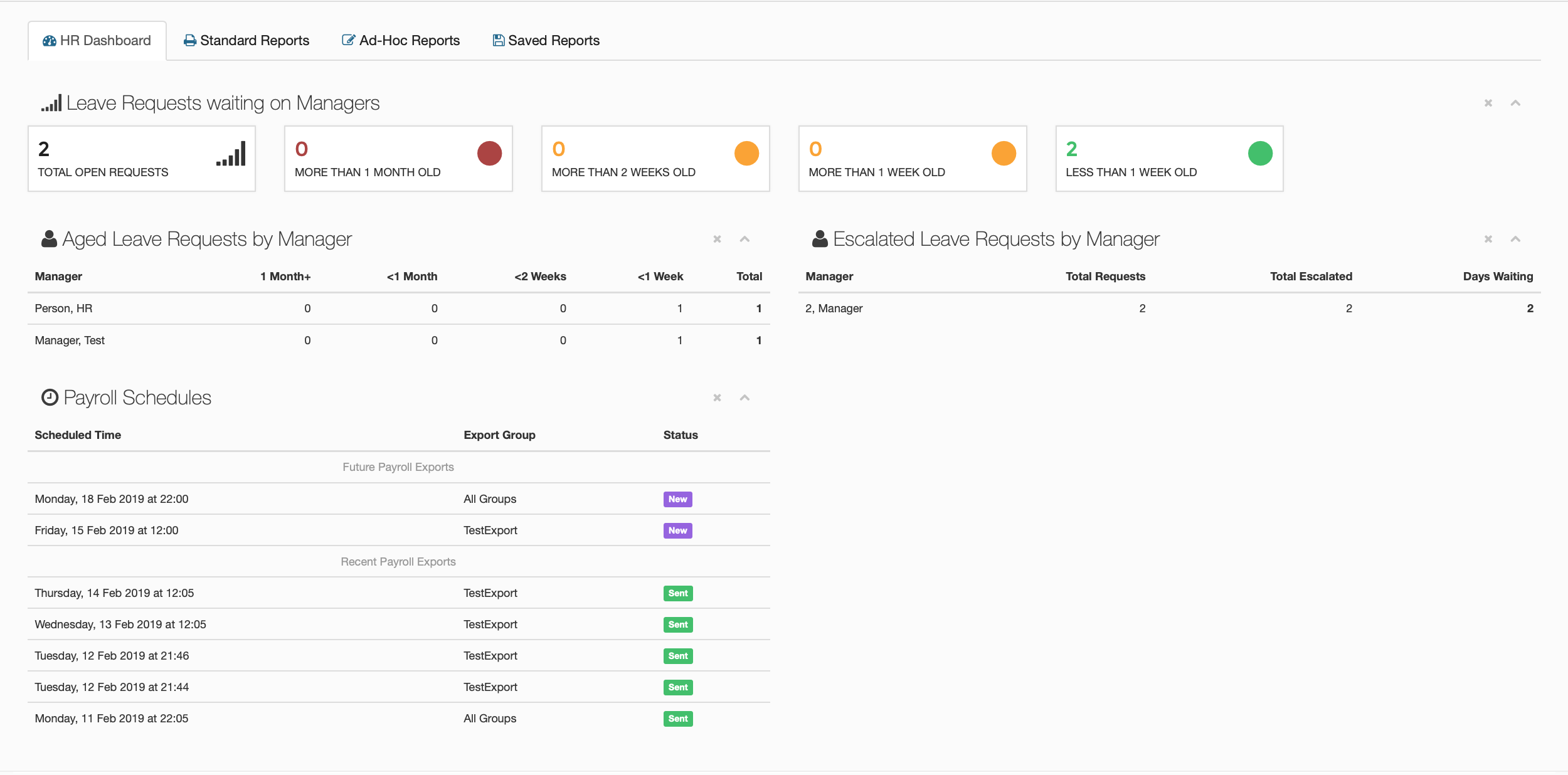 This is the screen you will see when you click on the reports page. It gives you a break down of any leave that has been requested as well as when that leave has been requested, if any of the requests have been escalated. You can alas see how old the escalations are and who they have gone to.