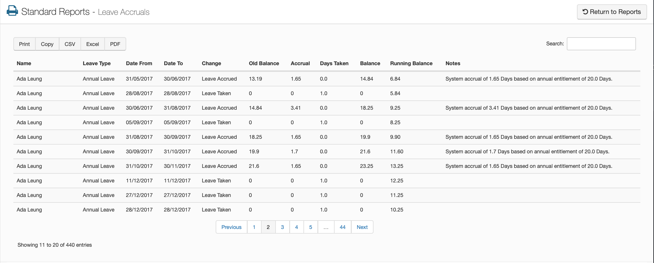 The Leave Accruals screen shows reconciliation of accrued leave against leave taken over time. You will be able to see this for all employees. This also shows any notes about the leave accruals that will be of use. If you need to you can also print this page to a local printer or copy to your clipboard. You can also change the format to a CSV, an Excel sheet or a PDF.