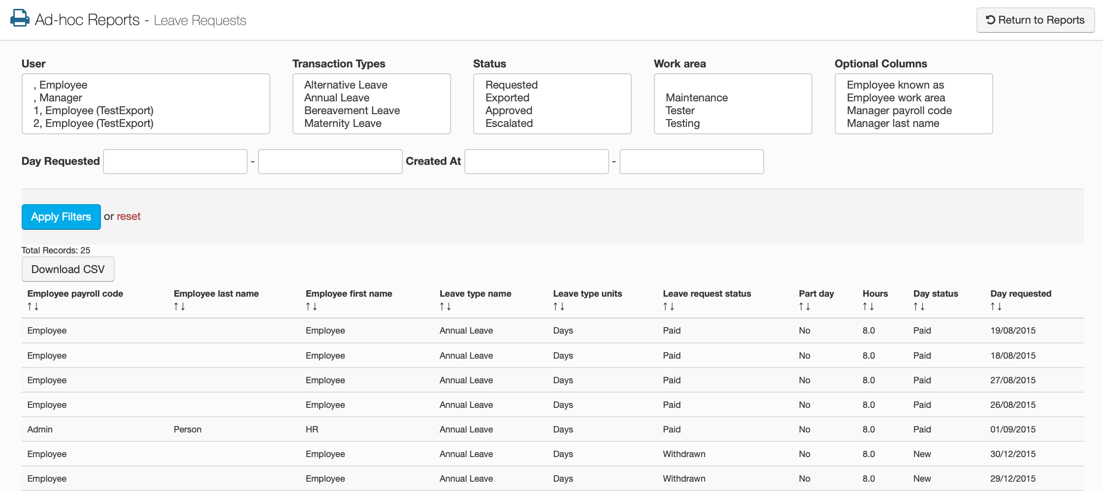 The Ad-Hoc reports contain a much wider spectrum of information than the standard reports that can be run. They are split up into four sections. They also come with a much more advanced filter which makes it much easierThis page will detail the Leave Requests report.