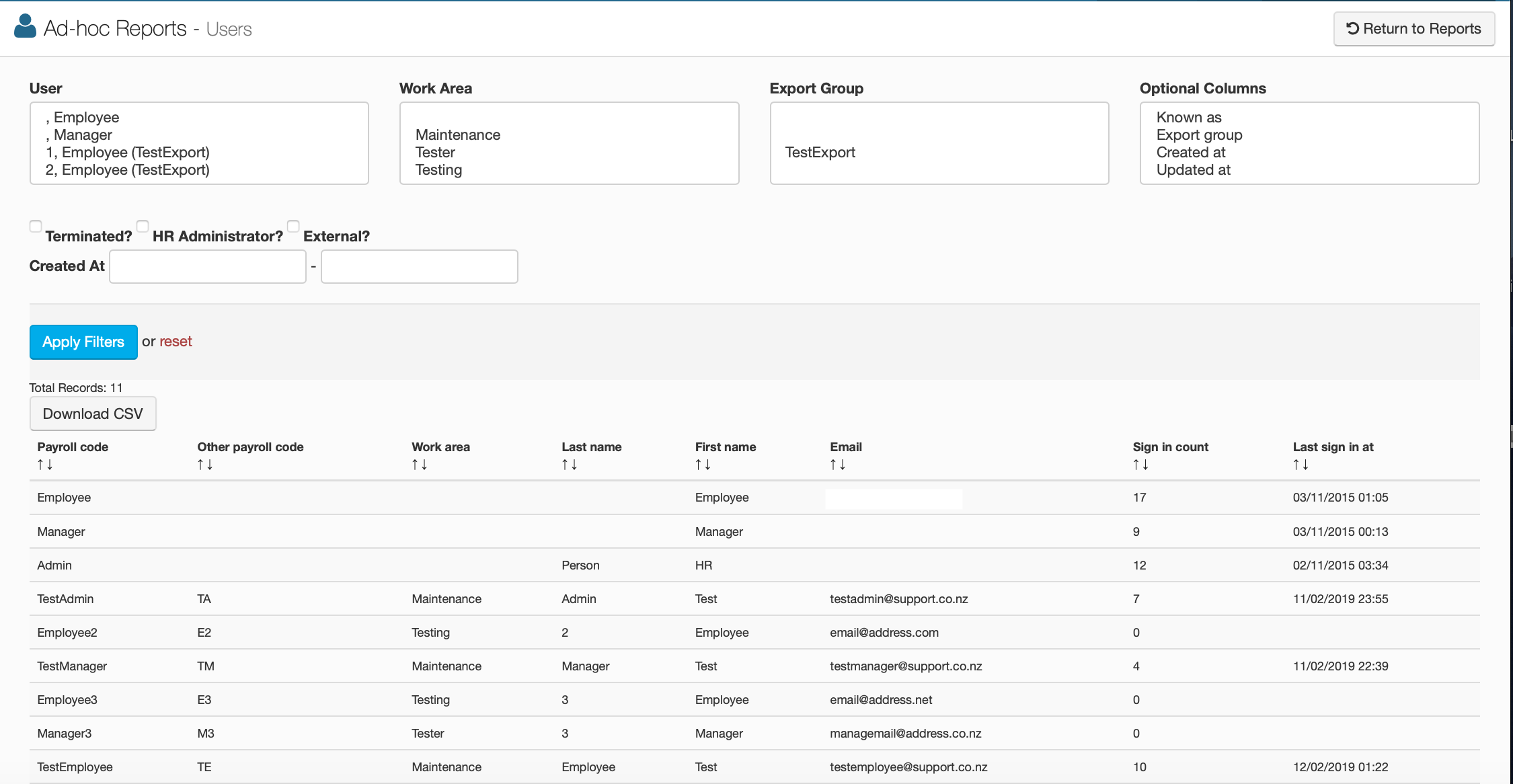 The Ad-Hoc reports contain a much wider spectrum of information than the standard reports that can be run. They are split up into four sections. They also come with a much more advanced filter which makes it much easier. This page will detail the Users report. These reports are only available to users who are manager or higher.